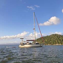 De retour à bord, on est tous un peu fatigués par le soleil. On range les courses, une bonne baignade, puis un repos mérité. En fin de journée, l’armada passe nous voir. On stresse un peu car notre despacho (autorisation locale de sortie) date de plus de dix jours. Mais ils ne nous embêtent pas : on leur explique qu’on s’est arrêtés pour se reposer. Pas de souci : si vous descendez à terre, il vous faudra simplement refaire un despacho ! On ne leur dit donc pas qu’on a déjà été à terre… mieux vaut rester discret parfois. Ils nous remercient avec un sourire et repartent.