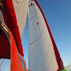 À 16 h, nous levons l’ancre. Nous allons naviguer de nuit. Nous tirons quatre bords pour sortir de la baie, puis c’est parti : nous débutons la nuit en descendant vers notre destination. La nuit est étoilée, le bateau gîte toutes voiles dehors sur une belle mer, la lune nous sourit d’un sourire fin. Nous devrions arriver demain matin à bon port !