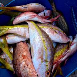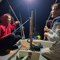 Le bateau ancré, nous nous lançons dans la préparation du poisson. Malo s’occupe de faire les filets : c’est impressionnant, il est très gros ! Heureusement, nous avons la machine sous vide, c’est l’usine. De mon côté, je prépare de quoi faire des sushis pour ce soir : on va se régaler.