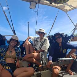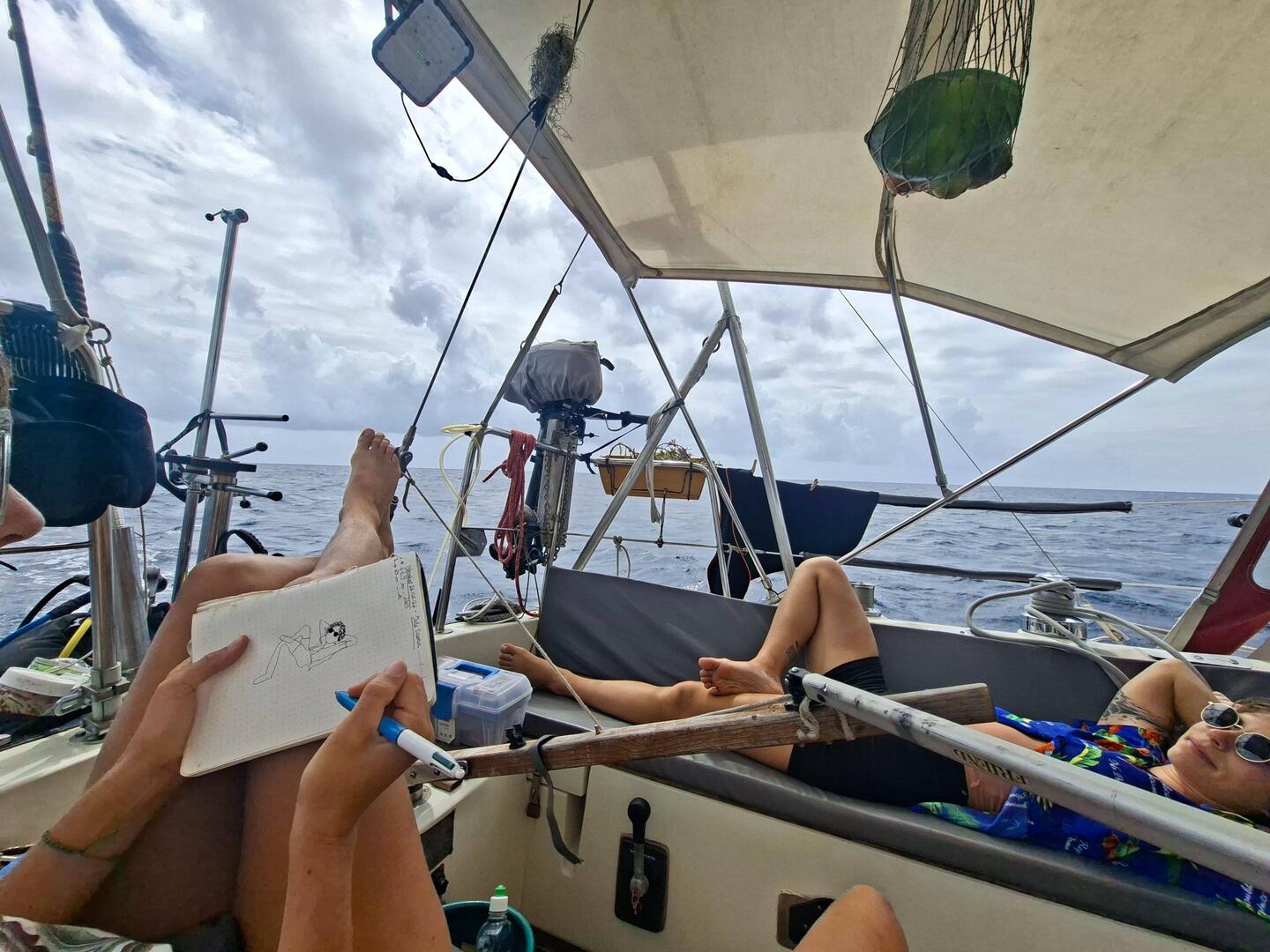 Après un dernier petit déjeuner face aux plages de Saona, nous levons les voiles. Un bon vent nous arrive au grand largue ; nous prenons deux ris dans la grand-voile et déroulons le génois. C’est un vrai plaisir : le vent nous porte tranquillement et la mer est douce. Nous mettons la canne à pêche à l’eau — on continue d’y croire ! On discute, on dessine, et on se laisse simplement porter par le vent.