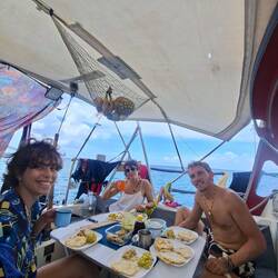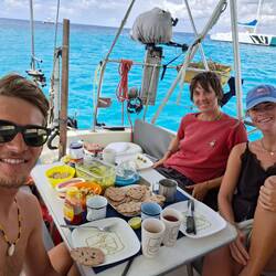 En rentrant, Bamba, un de nos contacts à Cienfuegos, nous amène les dernières courses que nous n’avons pas trouvées en ville : avocats, œufs… Livraison à domicile, c’est bien pratique. On rentre se poser à bord et, au même moment, on aperçoit un mât : ce sont les Blue Moana ! Ils sont rentrés de Trinidad et reviennent au mouillage. Nous passons une dernière soirée avec eux à bord de Blue Moana, autour d’un de nos traditionnels apéros. Ça y est, c’est le moment des séparations… On se recroisera peut-être en République dominicaine ou en Guadeloupe, mais pas avant un certain temps. Ça fait bizarre, on commençait à s’habituer à nos voisins de navigation après plusieurs mois. Bons vents les amis, à bientôt ✨🫶