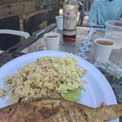 Le lendemain, le réveil sonne aux aurores : nous levons l’ancre à 6h30. Nous avons 30 milles à parcourir. On quitte le chenal et on se met sur notre cap. De petites vagues, régulières et de face, nous gênent dans notre progression. Nous sortons toutes les voiles, mais le peu de vent et la houle de face ne nous aident pas. Malgré tout, après huit bonnes heures de navigation, quasi toujours en appui moteur, nous atteignons le mouillage de Rio Hondo. Juste avant d’arriver à notre point de chute, la canne s’emballe ! Malo ferre le poisson et remonte un magnifique thon de 15 kg !! Située à côté de Trinidad, c’est une petite crique très jolie, avec la montagne en arrière-plan, un pont en face de nous et une jolie maison sur la gauche. Je saute à l’eau avec mon masque pour vérifier les fonds : c’est bon, c’est du sable, on va bien accrocher.