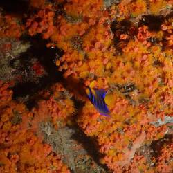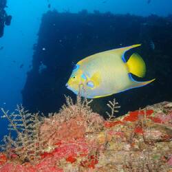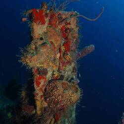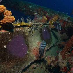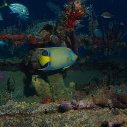 L’épave est impressionnante et repose à 43 mètres de fond. Nous explorons autour d’une profondeur moyenne de 30 mètres. Des bancs de carangues nagent autour de nous, tandis que des poissons-anges aux couleurs chatoyantes se cachent dans les éponges qui ont colonisé les restes du navire… C’est une très belle épave.