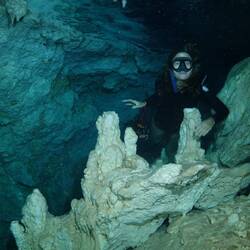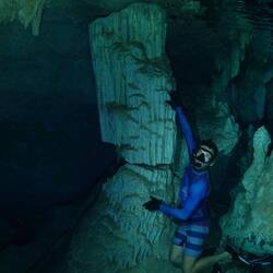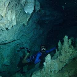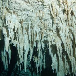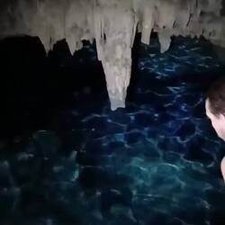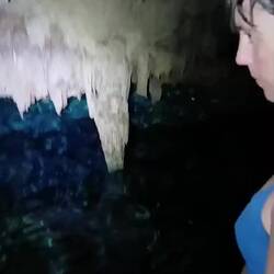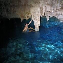 L’eau est fraîche mais pas glaciale. C’est supportable. Elle est d’une transparence incroyable. Nous descendons progressivement, entourés de formations blanches : stalactites et stalagmites semblables à des bougies de cire fondues.