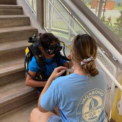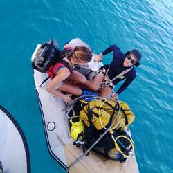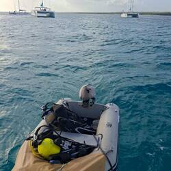 Samedi, c’est le jour de la grande exploration ! Nous avons préparé tout notre équipement de plongée afin de nous rendre à la grotte de Padre Nuestro pour y plonger. Les blocs ont été gonflés, les stabs gréées sur les bouteilles, le diable embarqué dans l’annexe pour faciliter le transport, les appareils photos chargés, et nous avons étudié le profil de la grotte en amont. Nous voilà fin prêts : nous embarquons le tout dans l’annexe et c’est parti. Agatha reste tranquillement à bord.