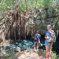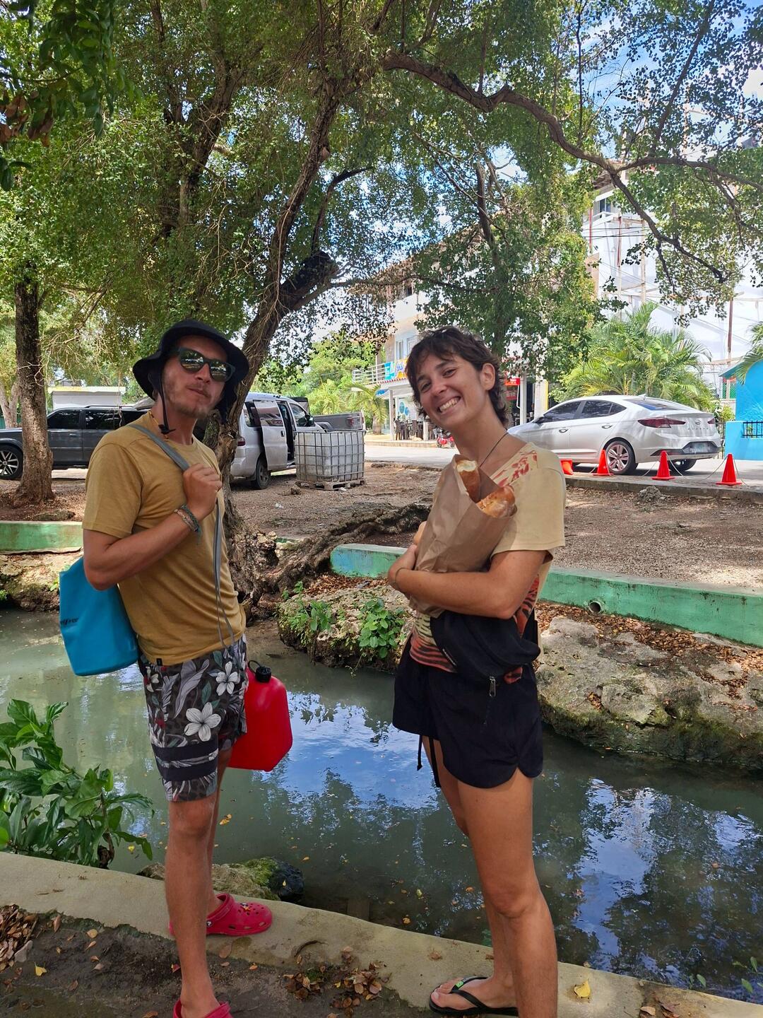 Nous quittons ensuite Fundemar pour aller chercher de quoi manger : riz, salade et poulet, achetés pour 400 pesos à emporter avec les travailleurs. Parfait ! Nous déjeunons tranquillement en regardant l’une des nombreuses cénotes présentes dans la ville.