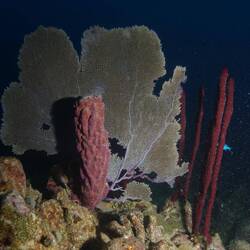 Le lendemain, on s’affaire pour aller plonger. Nous n’avions pas vraiment trouvé de tombants intéressants depuis notre arrivée à Cuba, mais ici, on passe de 3 mètres à 100 mètres de fond sur les cartes. Je sors le matériel : stab et détendeur, que je branche sur les blocs à l’arrière du bateau. On prend nos appareils photo, le tout dans le kayak, et avec l’annexe on rejoint notre point d’immersion. On plonge directement à 39 mètres : ça fait longtemps qu’on n’avait pas eu un peu de profondeur, on est contents. Le fond est assez vaseux et recouvre la roche. On observe un gros pagre, des gramas aux magnifiques couleurs violettes… En remontant progressivement, la plongée devient plus jolie : de beaux reliefs sur le récif, des gorgones et des éponges. Du zooplancton transparent oscille devant nous, tout comme de petites méduses. Après une heure sous l’eau, on remonte à la surface. On rince le matériel et on le fait sécher sur le bateau, tout comme nous : chacun allongé sur le pont, à profiter du soleil pour se réchauffer après l’immersion. Le soleil est agréable ici, juste à la bonne température. On se rend compte que depuis notre arrivée à Cuba, nous n’avons encore eu aucune pluie : c’est la saison sèche !