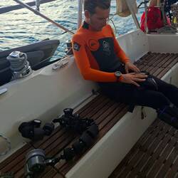 Il nous conseille également d’autres sites de plongée à proximité, accessibles avec notre annexe (maintenant réparée !). Les bras ballants, nous rembarquons tout notre matériel pour retourner à bord de Noam.