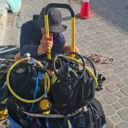 Nous avons à bord une petite bouteille de plongée de 6 litres, que nous utilisons habituellement pour la sécurité ou pour caréner le bateau. Elle tient dans un sac de randonnée : parfait. L’objectif est simple — faire passer la bouteille et le minimum d’équipement afin de pouvoir faire une petite incursion dans la grotte, ni vu ni connu !