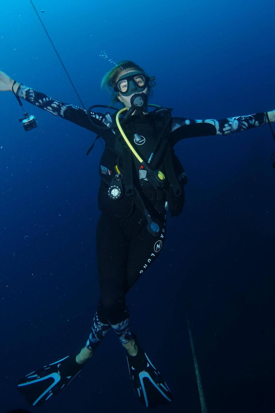 Après la matinée rocambolesque, nous retrouvons enfin le monde silencieux et bleu, rythmé par le souffle de nos bulles et les cliquetis du récif. Nous descendons le long du bout de la bouée et ne tardons pas à apercevoir la structure métallique de l’épave.