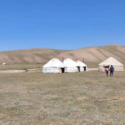 Da wir gestern schon mit dem Reiten abgeschlossen hatten (meine Knie eher früher) und davon ausgegangen sind, dass wir gemäß der Tourbeschreibung heute mit dem Auto zurück nach Kyzart fahren, bitten wir unseren Führer Samat einen Wagen zu bestellen (lt. ihm wären wir den Weg zurück geritten). Mal sehen was geht. Samat sagt: der Wagen kommt gegen ein Uhr und kostet 8.000 soums (ca. 80€). Wir sind irritiert aber das müssen wir sicher mit Bek, dem Veranstalter, klären. Jetzt erstmal bei kaltem Regen auf den Wagen warten. Samet verabschiedet sich schon mal, er muss die Pferde zurückbringen. Wir drücken uns abwechselnd im Dinner Room und in der Yurte rum. Langsam wird das Wetter besser, obwohl Samat sagte: wenn es Freitags anfängt zu regnen, dann regnet es 3 Tage (oder so ähnlich), aber es ist nicht mehr so warm wie gestern. Um zwei kommt tatsächlich ein Auto und wir heizen - ich würde sagen: in georgischer Manier - erst am See entlang und dann durch die Berge nach Kotchkor zurück. Dort sagt der Veranstalter, es sei ein Missverständnis unseres guides und die Fahrt kostet uns nichts. Passt.
