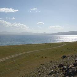 Nach einer Tasse Tee gehen wir vor an den See. Unterwegs kommen wir am Nachbarcamp vorbei, wo wir noch einen Rest Reiterspiele sehen. Zwei Jungs versuchen, sich vom Pferd zu ziehen. Der See ist wirklich riesig und die Bergkette im Süden sicherlich alles 5.000er. Es ist eine sehr schöne, irgendwie unwirkliche Atmosphäre. Wir sind zwar nicht die einzigen Touristen hier, aber mir geht schon durch den Kopf, dass hier nicht viele herkommen.