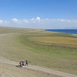 Heute geht es nach langer, eher unbequemer Nacht auf den Pferden weiter. Wir gewinnen stetig an Höhe, nach ca 1,5 Stunden haben wir einen Pass erreicht, sind auf 3300 m Höhe. Pause. Auf der anderen Seite kann man in der Ferne den metallisch-blau glitzernden songkül sehen. Je mehr wir herunterkommen, desto größer wird der See. Mittagspause in einer Yurtengruppe allein auf weiter Flur. Der Hintern tut weh, die Knie schmerzen.... und dann muss man auf dem Boden sitzend essen.