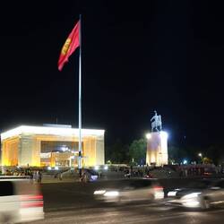 Am frühen Abend gehen wir zum Stadtzentrum, dem Ala-Too Platz mit dem kirgisischen weissen Haus, dem Völkerfreundschaftsdenkmal (Um das herum viel Volleyball gespielt wird), dem Nationalmuseum und der bewachten kirgisischen Flagge wo wir gerade zum Wachende kommen. Dahinter im Panfilow Park der unvermeidliche Rummel mit allem was so dazu gehört. Wir lassen uns treiben.