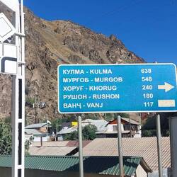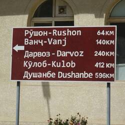 Ein Wegweiser zeigt uns, dass wir von Dushanbe aus jetzt 596 km zurückgelegt haben.