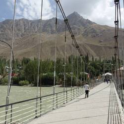Während wir etwas essen duscht Amon und dann geht's weiter auf der M41 bis wir ins Bartang Valley abbiegen, wo wir über eine Brücke gehen und dann 2 Stunden ins Dorf Jizeu wandern, während Amon mit dem Auto hinterher kommt. So jedenfalls unser Verständnis. Als wir an besagter Hängebrücke ankommen und ich nochmal frage, sagt er, er fährt 5 km zurück zum übernachten und hole uns morgen früh um 8 hier wieder ab. Unsere Fragen ob denn der Weg einfach findbar oder sogar bezeichnet sei versteht er nicht und ruft dann jemand an, die englisch kann. Es kommt raus, dass er den Weg auch nicht kennt, aber er sei einfach zu finden
