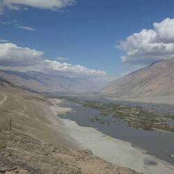 Heute geht's wieder ziviler los, wir fahren um kurz nach acht los. Es geht immer weiter den Panj River entlang. Der fließt hier nach Süden bis Ischkaschim, wo in normalen Zeiten der Grenzübergang nach Afghanistan und der Eintritt ins Wakhan Valley möglich sind. Aktuell ist der Übergang allerdings verriegelt. Hier in Ischkaschim machen wir auch Mittagspause.