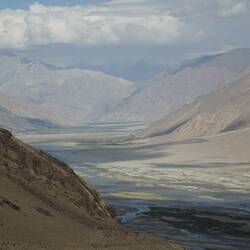 Die afghanische Seite sieht übrigens nochmal deutlich weniger entwickelt aus, als die tadschikische: wo es hier immerhin eine manchmal asphaltierte Straße gibt sieht es drüben nach kleinem Pfad aus. Manchmal sieht man "Dörfer", ein paar wenige Steinbauten, die daheim als historische Ruinen durchgehen würden, mit leeren Fensterhöhlen, kaum Licht, nur Trampelpfade, schon gar kein motorisierter Verkehr.