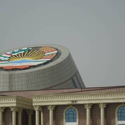 Dann in den direkt gegenüberliegenden Rudakipark, benannt nach dem wichtigen Dichter, zum Flaggenmast und zum Unabhängigkeitsplatz mit Turm. Von oben haben wir die erwartbar gute Sicht auf Dushanbe. Dann reicht's mir und Alaoudine muss bald beten, also zurück ins Hotel, wo Jürgen sich immerhin ein bisschen erholt hat.
