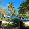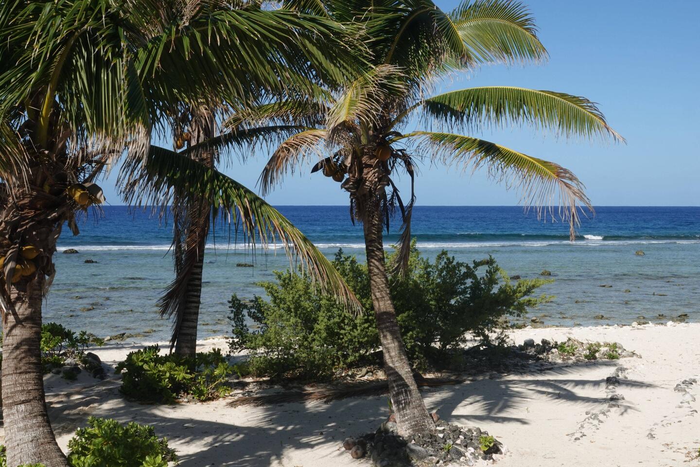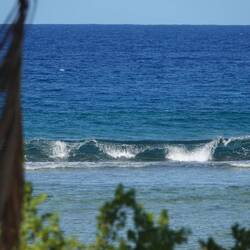 Frühstück bei schönstem Wetter im Freien von Kokospalmen und anderen Bäumen beschattet auf der Terasse, die Lagune von Asau im Blick. Kann man mal genießen.