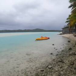 Um halb elf geht's dann los, mit einer Saab 340 hinein in das Südsee Klischee schlechthin. Nach 40 min Flug landen wir auf Aitutaki, das mit seiner türkisfarbenen Lagune wie ein farbverfremdetes Spiegelei in der See liegt. Kura unsere Gastgeberin, begrüßt uns mit Blumengirlande am Flughafen und schon rollen wir mit gefühlt 10 km/h zu unserer "Residenz", dem Rangiriri Vacay 1.