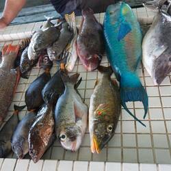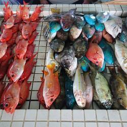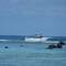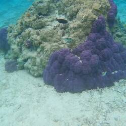 Wir werden gegen halb neun aufgesammelt und zum Startpunkt unserer Teking Tours Schnorchelsafari gebracht. Heute 2 Boote mit je 20 Leuten drauf. Wenn der Capt'n deutlich besser Boot fährt als er spricht - wenn er mal was sagt - kanns was werden. Und es wird was: Anfangs noch stark bewölkt wird es im Laufe des Tages immer besser und die Komposition der unterschiedlichen Blau- und Türkistöne ist einfach der Hammer. Nich so'n Hobbyhammer, nee, sondern so richtig Vorschlaghammer. Sowas haben wir noch nicht gesehen. Erster Schnorchelstop ist in einem Gebiet mit giant clams. (Klingt blöd, aber) am Barrier Reef damals waren sie größer und bunter aber es ist trotzdem toll, weil wir auch näher dran sind. Ok, ich muss mich erstmal wieder an das Schnorcheln gewöhnen.