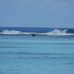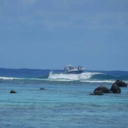 Aber beim 2. Stop ist es schon viel besser: deutlich näher an der Rifflinie, wo sich pausenlos riesige Wellen brechen, steigen wir zu Giant Trevallys ins Wasser (ich finde Giant Trevally hört sich dramatisch besser an als Dickkopf-Stachelmakrele). So ca. 1 m lang und oft hurtig unterwegs scheinen sie überall zu sein. Spannend. Nach einem kurzen Stop auf honeymoon Island und Maina zum lunch geht's zum letzten Schnorchelstop für die pearl corals. Sattdunkelblaue Korallen, bunte Fische und unverschämt onyxblaue Seesterne auf makellos weißem Sand. Schon gut. Dann geht's weiter nach One Foot Island zum Pause machen oder auch - angeblich - den Pass stempeln zu lassen. So gegen halb vier sind wir dann zurück im Rangiriri - und komplett entschädigt für gestern.