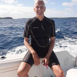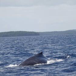 Bald haben wir Buckelwale gefunden, eine kleine Schule mit drei Tieren. Schon mal gut, teilweise recht nah. Stark. Aber sie bewegen sich ständig und es dauert, bis wir ins Wasser dürfen. Inzwischen ist doch ein bisschen Dünung und meine Maske und Schnorchel sind nicht dicht, ich habe große Mühe ruhig zu atmen und die Wale sind schon längst wieder weg. Anstrengend. Für Martina so sehr, dass sie beschließt, nicht mehr ins Wasser zu gehen. Ich versuche es bei der nächsten Gelegenheit nochmal und es klappt schon besser. Und dann ziehen doch die Wale tief unter mir vorbei!!! Nicht so richtig nah, aber doch gut erkennbar. Wahnsinn.