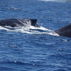 Dann wieder auf dem Boot und zack - springen sie. Einmal, zweimal, dreimal, das ganze Boot ist aus dem Häuschen (ok , Guide und Skipper nicht sooo). Dann schlagen sie mit den Fluken das Wasser und einer scheint uns mit seinen Flippern zu winken. Einfach Klasse. Zwischendurch ziehen sie immer wieder am Boot vorbei. Die diversen Kameras und GoPros glühen...