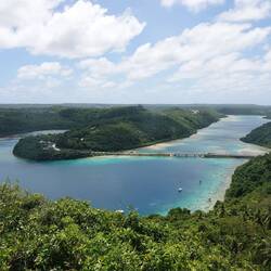 Erstmal ausgewassert. Der Chef der Mangobar vermittelt uns einen Typ, der uns wiederum zu einem etwas "unscheinbaren" Autoverleih bringt. Egal, wir kriegen ein Auto bis heute Abend 8 Uhr. Dann schauen wir uns den lokalen Markt an, den Utukalongalu Farmer’s Market. Ist überschaubar und die geschnitzten Buckelwale passen weder in den Geldbeutel noch ins Gepäck. Dafür entstehen wir ein Tapa, eine Art Bild, angeblich aus der Rinde der Bäume hier gemacht. Hauptsache es gefällt uns. Dann fahren wir zum Mt. Talau, dessen sehr steile Treppen erstmal erklommen werden müssen. Aber dafür wartet oben, ich würde sagen, eine der 5 besten Aussichten, die ich je hatte. Sehr, sehr schön.