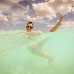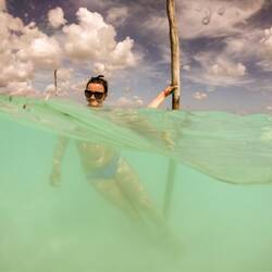 Auch wenn in der Lagune von Bacalar angeblich Krokodile leben sollen, haben wir keine gesehen und den Sprung ins Türkisblaue erfrischende Wasser gewagt.