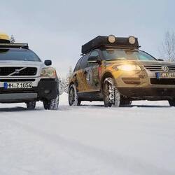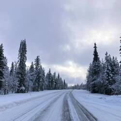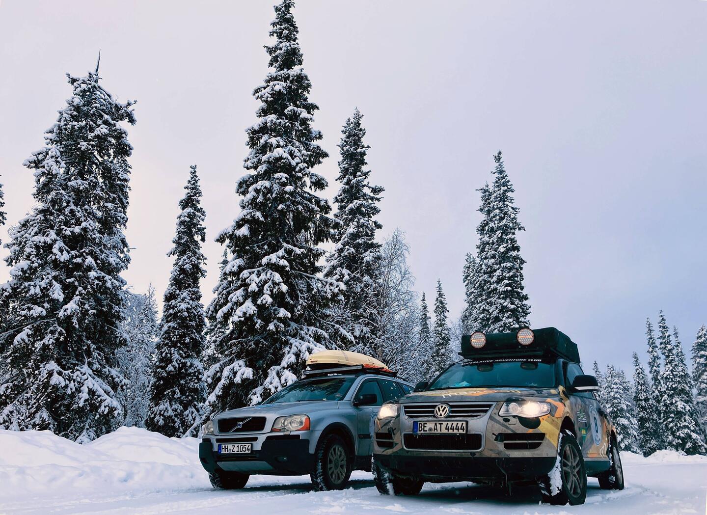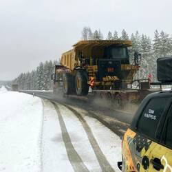 Es geht stundenlang über verschneite Straßen. Ein Highlight abseits der traumhaften Landschaften bieten zwei wirklich große Schwerlasttransporter.