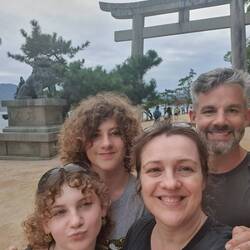 After checking in, we wandered down the narrow streets filled with traditional dwellings (much like Tsumago), some bustling with a marketplace vibe of new foods, touristy gift shops and a few very cool niche stores. Built over the water, The Itsukushima Shrine was peaceful to walk through, the sun setting behind the Gate making it a popular selfie spot. The kids took a moment to sit down, legs dangling over the edge to chat and laugh, no doubt at their mum's obsession with taking photos. Paul and I took a moment to offer a donation and pray at the shrine; the energy was really different there. It is difficult to explain but peaceful and expansive, a great meditative space.