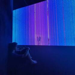 You took off your shoes, rolled up your pants, walked through an uphill "water exhibit" that was 80% chlorine, then dried your feet and bounced through a padded room. It was a clever public hygiene ploy, as the next room was filled with LED lights and mirrored floors.