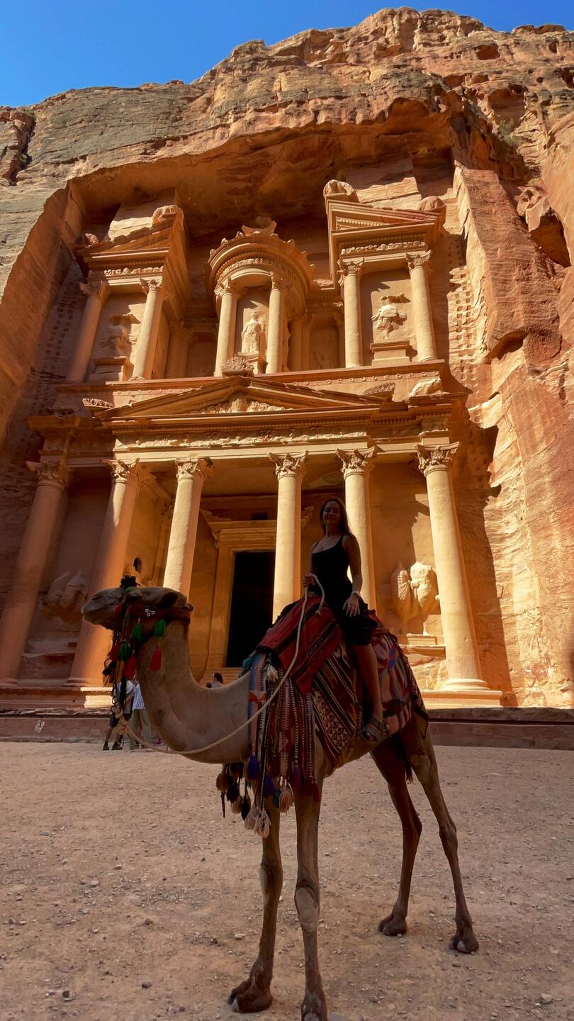 I couldn’t resist climbing onto a camel for some fun photos in front of it. Sitting there, with the Treasury towering behind me, it felt like I was on the front of a postcard.
