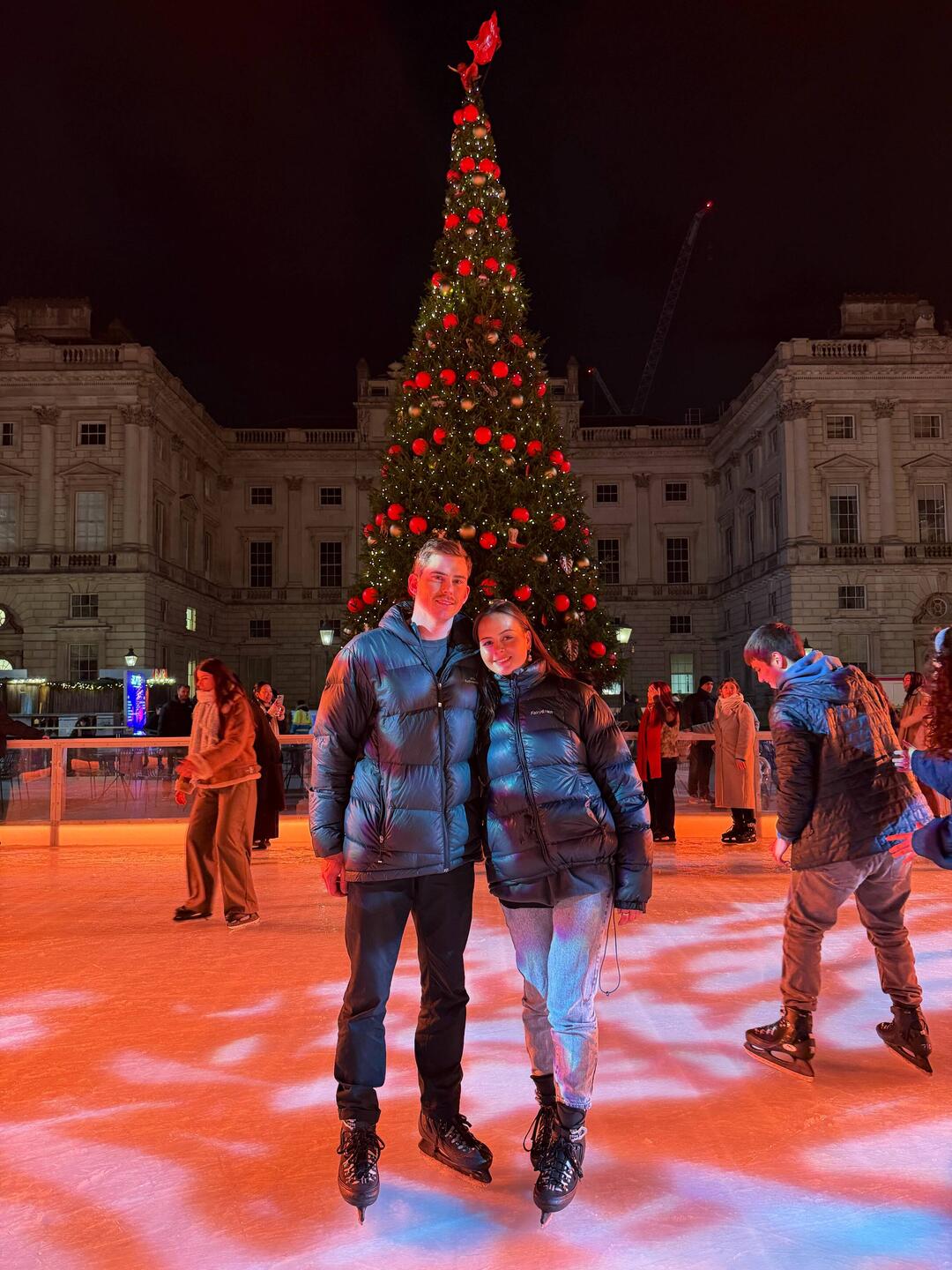 But the night wasn’t over yet. Next up… Ice skating!!! We headed to Somerset House, where the rink was beautifully set up for winter. We booked a session and, with some time to kill, wandered down the road to check out the Leicester Square Christmas Market. On the way we even bumped into someone we know what are the odds?! The market itself was packed and not overly impressive, so we didn’t stay long before making our way back for skating.