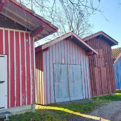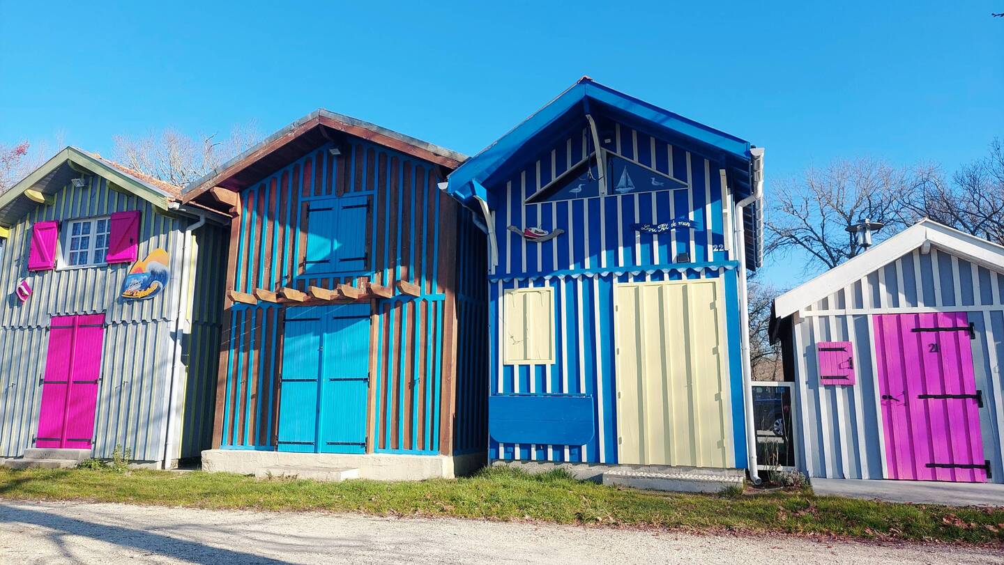 Ein ganz kleiner Hafen mit vielen bunten Holzhütten.