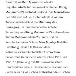 Ich habe gerade das Mausoleum von Mohammed V. besucht. Ich wurde wieder ermahnt, da ich eine Treppe runter gehen wollte, was verboten war. An jedem Eingang stehen Tag und Nacht zwei Reiter. Es warenRead more