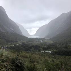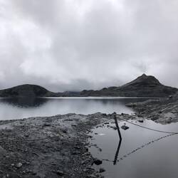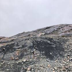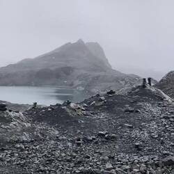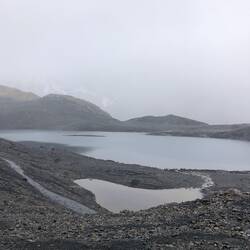 On attend 1h en haut en espérant que les nuages libèrent le glacier mais le ciel reste couvert et on doit continuer notre route ☁️
