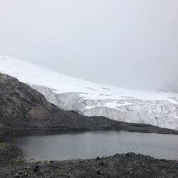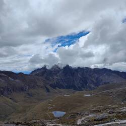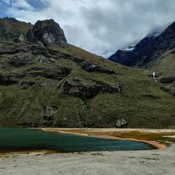 C'est parti pour 8h de marche et une longue ascension, le ciel est d'abord dégagé puis il se couvre vite, heureusement pour nous au cours de la montée, on a la chance d'observer l'Alpamayo de plus près. On passe par la lagune (encore une) Arhuaycocha (4420m). Le lac est encore magnifique, est entouré de haut sommet dont la fameuse plus belle montagne, et d'un glacier qui se jette dans l'eau. On est seul et l'ambiance est très apaisante. On entend la glace craquée, c'est assez impressionnant. Dommage les nuages couvrent une partie du spectacle.