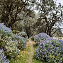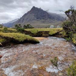 On entame la redescente en passant par une ancien fleuve formé par la fonte d'une avalanche. C'est le changement de décor on marche sur du sable, on traverse des champs de petites fleurs violettes et c'est le pays des cascades qui descendent des montagnes. Malheureusement la pluie vient nous chatouiller mais pour une petite heure seulement.