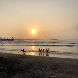 Tentative culturelle, on monte dans un bus pour visiter le fameux site archéologique de Chan Chan, mais nous avons été trop gourmands en sieste et les péruviens ne sont pas des travailleurs de fin de journée, alors c’est une mission remise au lendemain. On se console en regardant les surfeurs au coucher du soleil, on repère les meilleurs spots pour faire aussi bien.