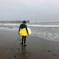 Aujourd'hui la mission est claire "devenir des purs riders de swell péruviens". Je traduis : "pratiquer le surf pour la première fois au Pérou pour Méli, Emma et Oriane". Pour ma part j'ai déjà des bases en surf. Un peu de pression donc pour moi ce matin, car je suis nommé professeur de surf. Le réveil est fixé à 8h30 après un petit porridge au lait de soja et au bananes, on est fin prêt pour une matinée sportive. La fine équipe de surfeurs Emma Meli Oriane et Clément s'élance.