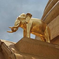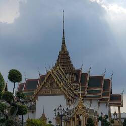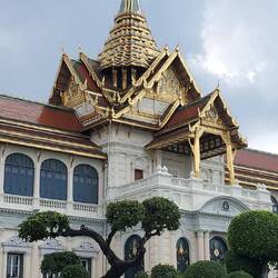 Am ersten Tag haben wir die nähere Umgebung unserer Unterkunft im Zentrum der Stadt zu Fuss erkundet. Wir waren im buddhistischen Tempel Wat Bowonniwet, an der touristischen Khaosan Road und im grossen Palast. Er müsste eigentlich "gigantischer" Palast heißen, weil er eine Fläche von 218.000 Quadratmetern und eine 19 Kilometer lange Mauer hat. Der Palast war nicht nur das Zuhause des Königs, sondern beherbergte auch die Staatsverwaltung und viele Tempel. Deshalb gab es auch strikte Kleidervorschriften und Kerstin musste sich ein "schickes" T-Shirt kaufen, um die Schultern zu bedecken. Aus diesem Grund tragen auch sehr viele Besucher die äusserst modischen mit Elefantenmustern bedruckten Hosen, die man überall kaufen kann. Warum in anderen Tempeln diese Vorschriften nicht gelten, können wir nicht wirklich nachvollziehen. Dafür konnte Kerstin am Ende des Besuchs eine dänische Touristin mit dem T-Shirt glücklich machen, die wegen der Vorschriften ganz verzweifelt war.
