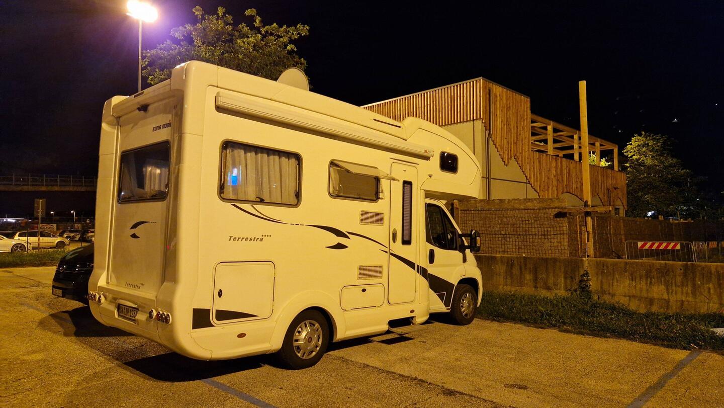 Sind an unserem 1 Zwischenstopp angekommen .An Einem Womo Stellplatz in Trentino. Nach 7,5 Stunden Fahrzeit mit einer Stunde Stau insgesamt am Brenner .