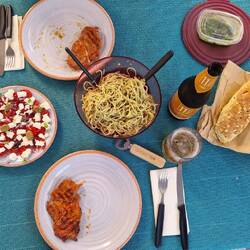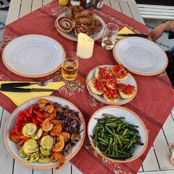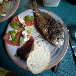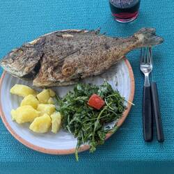 Haben heute zu Fuss einen 10 km Ausflug nach vada gemacht. Dort eine Dorade eingekauft für heute Abend .
