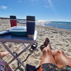 Sind heute bis zum ersten Campingplatz gefahren . Unsere erste Tat war an dem Strand zu gehen und ein schönes kaltes Bier zu trinken .