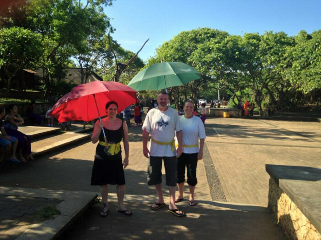 06Mitarbeiter stehen mit Zwillen am Wegrand und schießen auf die Affen, um sie zu vertreiben. Es ist wahnsinnig heiß, also gehen wir mit Schirmen los um uns vor der Sonne und … den Affen zu schützen. Claudia spendet 10.000 Rupia und bittet an einem Tempel um gutes Karma und gutes Wetter in Deutschland. Sie denkt halt an die “Zurückgebliebenen” und etwas Scham für meine Schadenfreude steht mir ins Gesicht geschrieben. Zurück am Auto geht’s zur Bucht Padang Padang. Ein kleiner Strand zwischen Affenfelsen und Meer. Erstmals sehe ich Lifeguards, da sich hier auch viele Surfer aufhalten. Wir bleiben bis zum Sonnenuntergang, Romantik liegt in der Luft. Uwe und Sonja haben bestimmt heimlich geknutscht, Claudia und ich haben an unserem Eis geleckt.