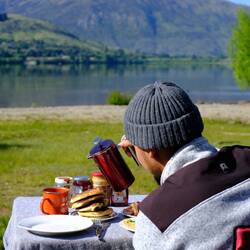 Nous nous réveillons dans les hauteurs de 'Queenstown' ce matin. Le temps étant frais, nous décidons de quitter 'Crowd Road Range' directement, pour aller petit-déjeuner au bord du lac 'Wakatipu'.