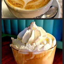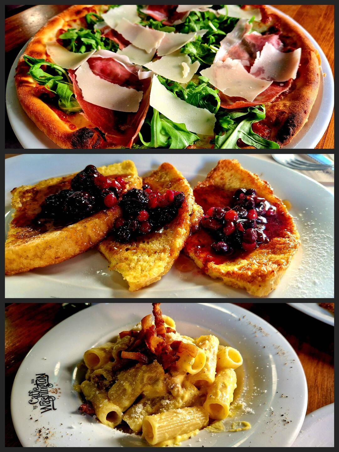 Ein Haselnuss Cappuccino, ein Cinnamon Dolce Latte, Spaghetti Carbonara, eine Pizza Pama und French Toast im Caffe Washington😅😜😋